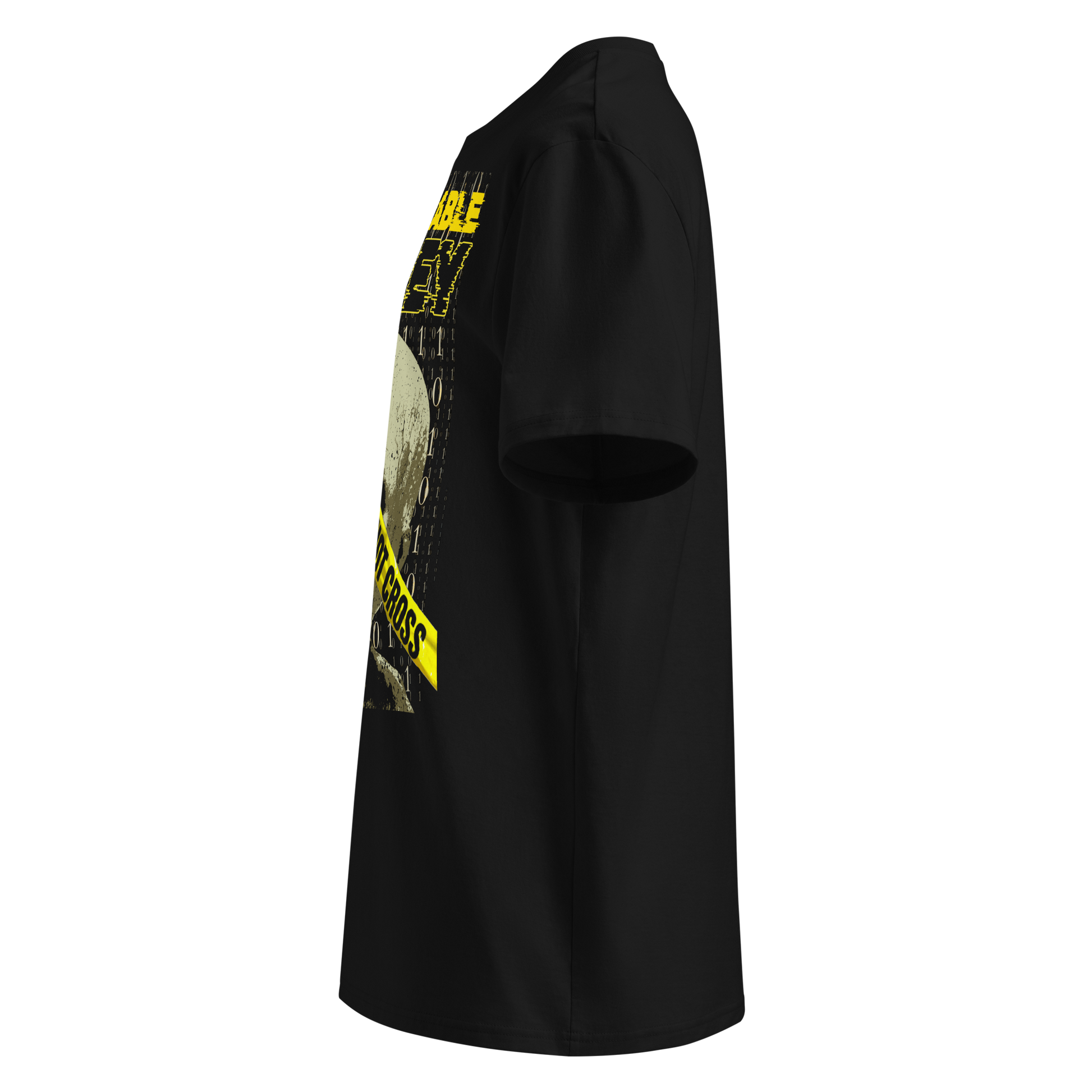 Printed on a heavyweight black cotton tee, this piece combines dark digital aesthetics with modern streetwear.
