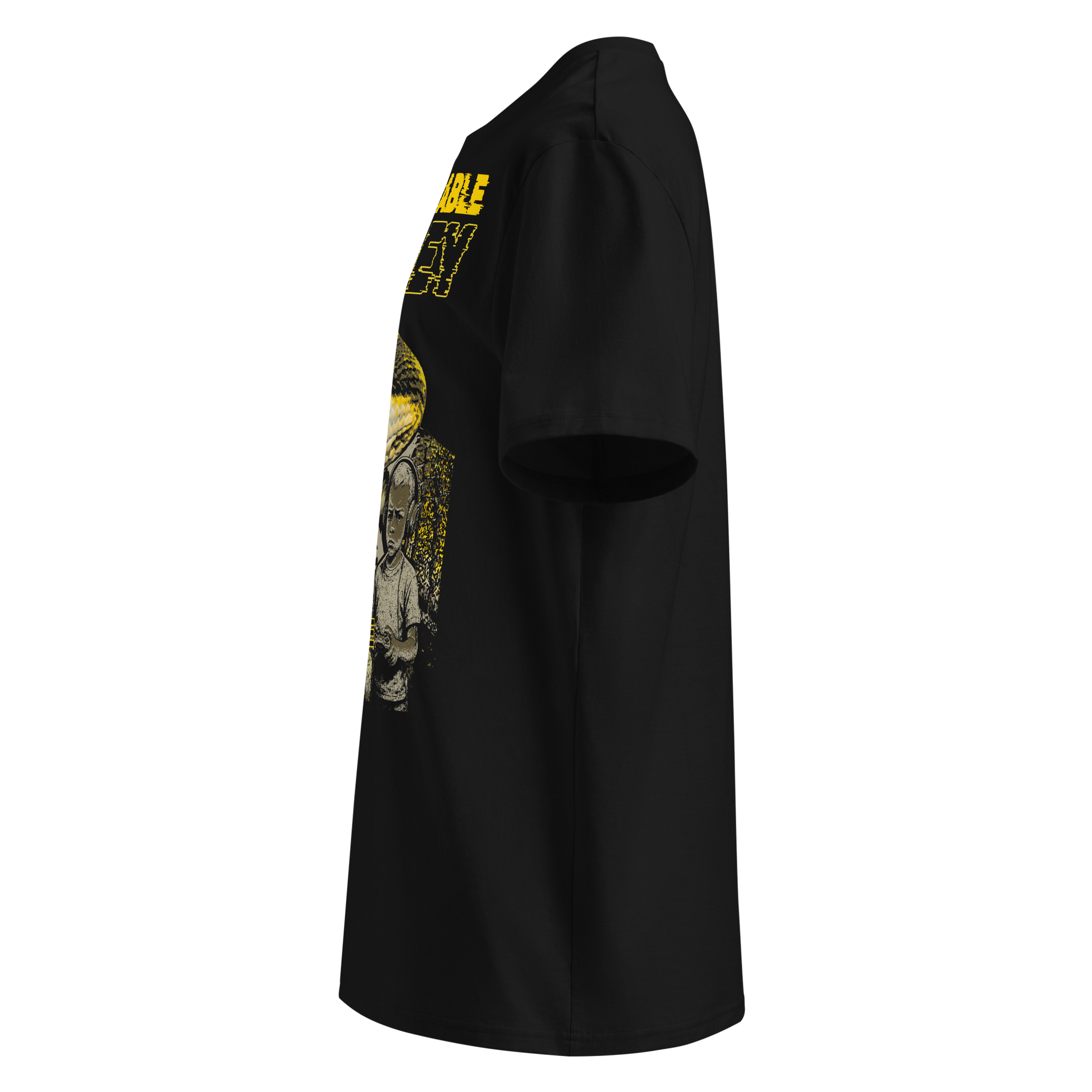 Printed on a black heavyweight cotton T-shirt, this piece blends dark symbolism with bold streetwear design.